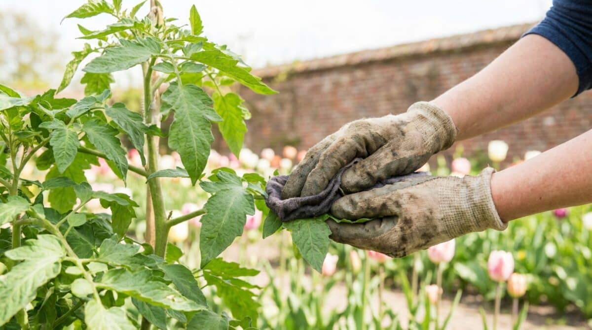 Deze verrassende badkamerhulp is een vochtig doekje, gedoopt in lauw water met een druppel milde afwaszeep. Door hiermee voorzichtig over de bladeren en stengels van je tomatenplant te wrijven, verwijder je niet alleen de zichtbare beestjes, maar ook hun eitjes.